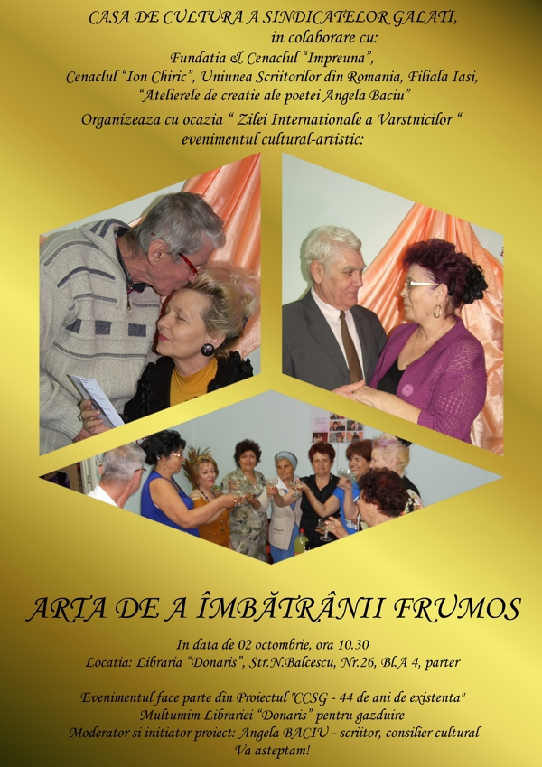Casa de Cultura a Sindicatelor Galati, in colaborare cu Fundatia & Cenaclul “Impreuna”, Cenaclul “Ion Chiric” CCSG, Uniunea Scriitorilor din Romania – Filiala Iasi, “Atelierele de creatie ale poetei Angela Baciu” organizeaza cu ocazia „Zilei Internationale a Varstnicilor” evenimentul cultural-artistic “ARTA DE A IMBATRANI FRUMOS”